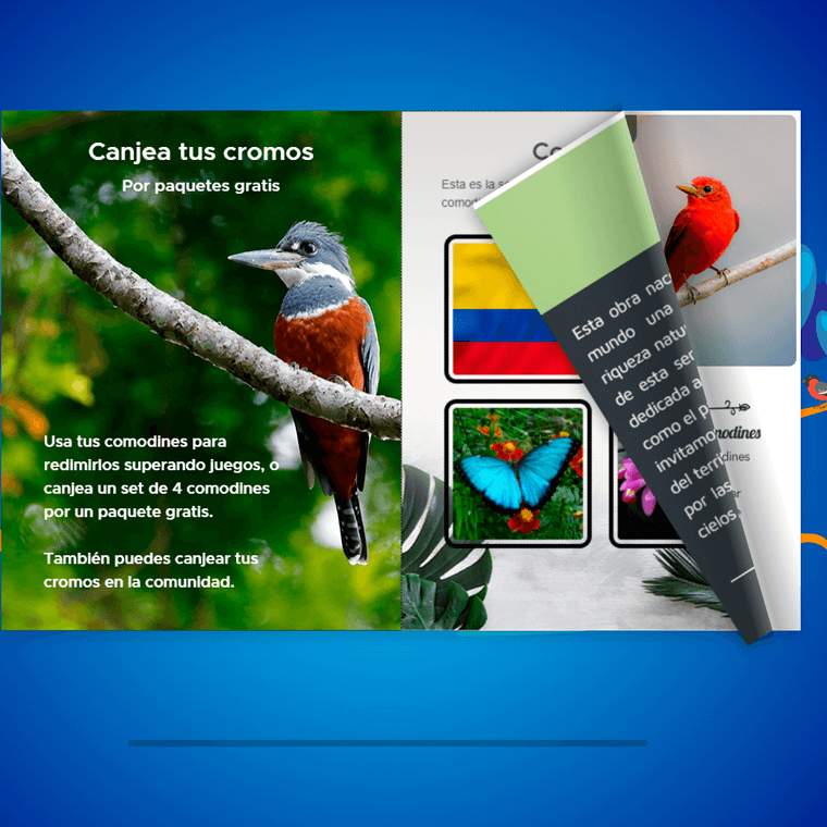 El proyecto Aves de Colombia es un álbum de figuritas digital, donde aprendes sobre 223 aves de todas las regiones de Colombia, con desafíos lúdicos y trivias. Haz clic aquí para conocer más sobre Aves de Colombia